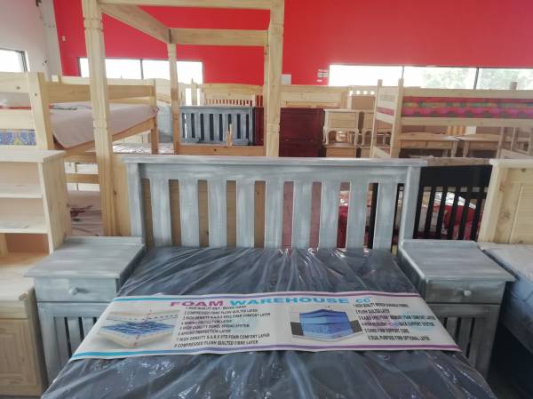Single - R950 Raw / R1299 Varnished. 3/4 - R1050 Raw / R1399 Varnished. Double - R1150 Raw / R1550 Varnished. Queen - R1250 Raw / R1750 Varnished. King - R1450 Raw / R1950 . Bedside Tables sold Separately.